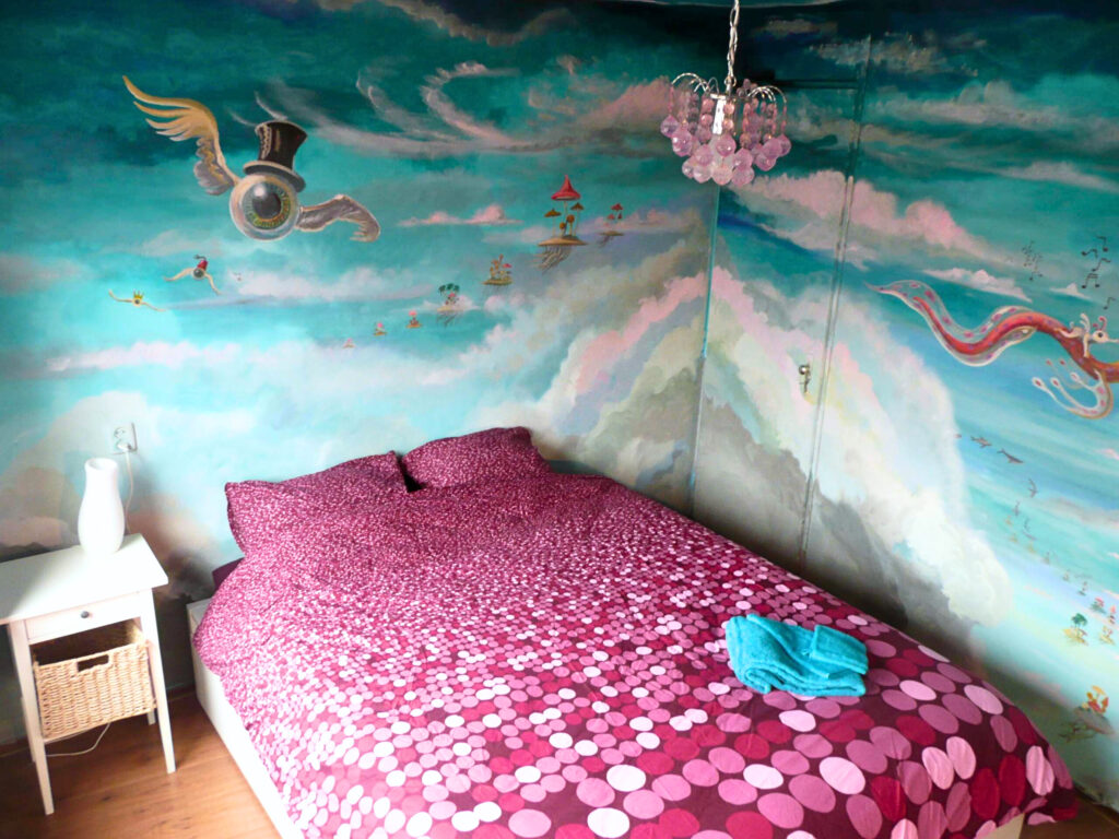 La champi-chambre est une œuvre de Kamiel Proost, peintre, poète et artiste multiforme d’Amsterdam. Depuis plus de 25 ans, Kamiel crée des univers imaginaires époustouflants avec un style surréaliste, céleste et onirique. Parmi ses influences, on trouve à peu près de tout entre les tatouages mexicains et Hieronymus Bosch. Si vous voulez voir d’autres facettes de son œuvre, une visite à Kokopelli au centre-ville est fortement recommandée. On y trouve des originaux, impressions et posters de ses peintures.